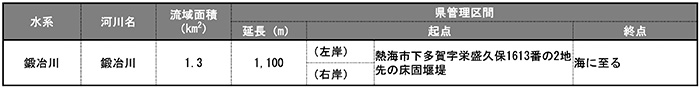 鍛冶川(かじがわ) [延長]1,100m [起点]熱海市下多賀字栄盛久保1613番の2地先の床固堰堤 [終点]海に至る