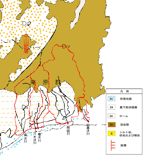 清水区蒲原は海岸沿いにわずかに平坦地がある程度で、大部分は丘陵(海岸段丘)や山地に覆われています。 また、駿河湾と糸魚川(いといがわ)を結ぶフォッサマグナ地帯に位置しており、流域の北側には中山断層が走っています。 清水区蒲原における地質は、駿河湾沿岸部の沖積層、東名高速道路から標高200m以下の丘陵部に位置する細かい礫を主体とする洪積層(蒲原累層)、中山断層より南に位置する溶岩類に区分されています。