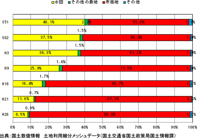・一方、田畑など農地は昭和51年は42.3%を占めていたが、農地の割合は減少し平成26年は9.4%である。