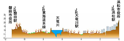 下図は河口より7km付近の断面図です。右岸側に浜松市街地、左岸側に磐田市街地が広がっています。横断形状を見ると、両岸の市街地は天竜川の氾濫減内に広がっている事がわかります。