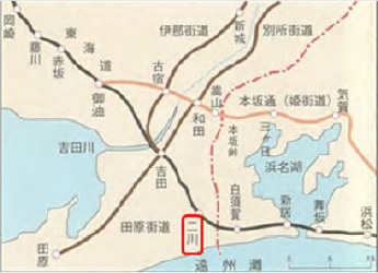 梅田川流域内に位置する二川宿は、江戸時代に整備された東海道の宿駅(東海道五十三次)のひとつで、江戸から33番目の宿である。当初は二川村と大岩村の二ヶ村で一宿として業務を行っていたが、交通量増加に伴い、小さな両村にとって負担が増大したため、正保元年(1645)、幕府が二川村を現在の地に移転させ、二川宿と加宿大岩町からなる宿場を形成した。